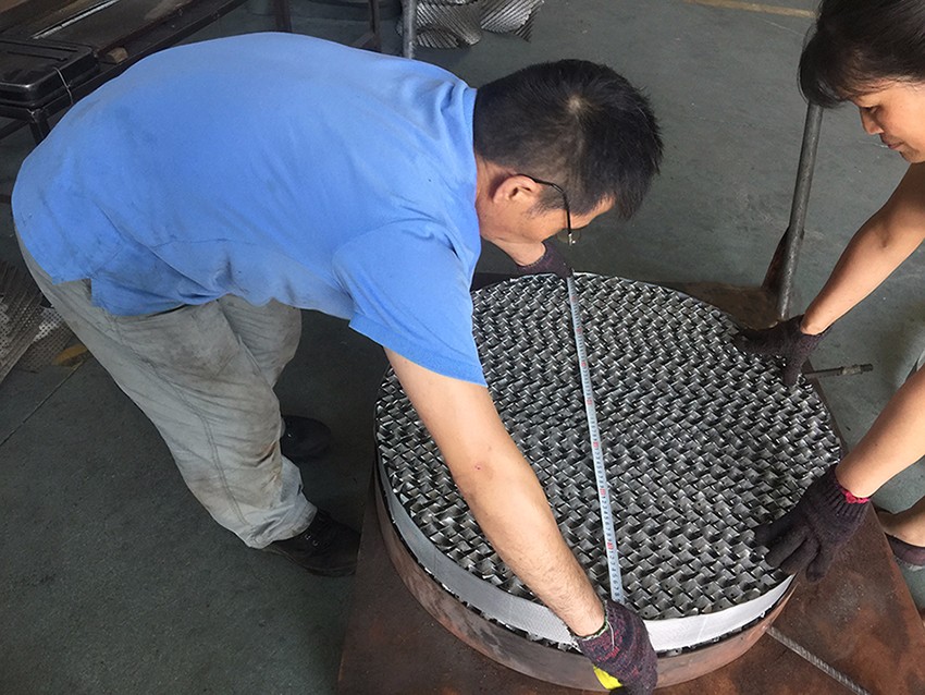 2017年7月間,氣溫高達40℃以上,在如此惡劣環(huán)境的情況下,我廠(chǎng)質(zhì)量檢測人員在加工工人的配合下頂著(zhù)酷暑對我廠(chǎng)加工產(chǎn)進(jìn)行檢測。 我司規定,自動(dòng)加工產(chǎn)品是對產(chǎn)品質(zhì)量進(jìn)行抽檢,半自動(dòng)加工產(chǎn)品以及手工加工產(chǎn)品質(zhì)則需對產(chǎn)品質(zhì)量一一進(jìn)行檢測。 SM250型直徑為810的孔板波紋填料為半自動(dòng)手工加工產(chǎn)品,質(zhì)量檢測人員核實(shí)孔板設計數據,檢測孔板波紋填料的實(shí)際直徑。對技術(shù)人員提出保證峰高估算距離合理性的建議,對加工工人提出保證每片孔板長(cháng)度的精確度達到±0.5mm。以保證產(chǎn)品符合合同要求,保證滿(mǎn)足客戶(hù)所需,保證產(chǎn)品質(zhì)量100%合格。